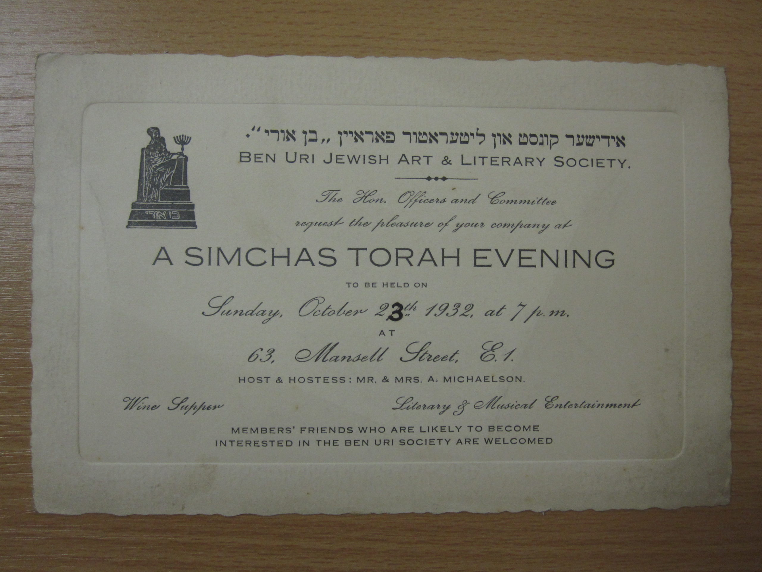 Commercial | Communal Records | Cultural | ImmigrationPartially online Ben Uri Archive Invitation to a Simchas Torah evening 1932 • Ben Uri Collection The Ben Uri Archive is a specialist archive accessible to the public held by the Ben Uri Gallery and Museum, based in London. It holds the records of the Gallery and Museum. Archive Description Ben Uri is the UK’s oldest Jewish cultural organisation, founded in 1915 as an art society serving newly-arrived Yiddish speaking ostjuden in London’s East End,by Russian émigré artist-craftsman, Lazar Berson. The main function in its distinctive 100-year plus heritage is the exhibition of artworks by artists of mostly Jewish descent, within the broader context of Jewish migration, London’s Jewish community, and British and European modern art history. The archives provide important traces of the early careers of major Jewish artists in Britain, such as the Solomon dynasty, David Bomberg, Mark Gertler, Frank Auerbach, Leon Kossoff, and Gustav Metzger. Numbering several thousand items, the archive consists primarily of exhibition catalogues, invitations and material concerning exhibition planning; council and committee minutes; correspondence; annual reports; press cuttings; photographs, and ephemera relating to cultural and social events, including concerts, lectures and fundraisers. The underlying narrative reflects the financial status and social and political interest of the London (British) Jewish community at the time, with particular reference to waves of immigration from Russia at the turn of the 20th century / pre-First World War, and then from central Europe, pre- and post-Second World War. In 2014-16 funding from the Rothschild Foundation enabled two consecutive short-term archivists to catalogue the above items, creating an archive database, which is available online, while translation of Yiddish material (including Ben Uri’s earliest minutes, held in YIVO, New York) was undertaken by the Department of Jewish Studies, UCL, London. The archive also contains Ben Uri’s contemporary record ssince 2000, as yet not catalogued, relating to day-to-day administration, governance and finance, strategic shifts in width of focus, and mental health and school/family learning programmes. Access Information The archives are open to the general public. Users are requested to provide two days advance notice for physical access, and up to a weeks notice if the items are located in the archive’s stores. Enquiries can be made online. Online Accessibility During 2019-20, Ben Uri undertook an ambitious programme, digitising a portion of their archive material, resulting in around 10,000 pages of scans which are available online via Ben Uri’s research portal.The archive’s catalogue is also available online and is searchable by artist’s name and by a number of other criteria, including Jewish subject matter online. Street Address Ben Uri Gallery108a Boundary RoadLondonNW8 0RH http://www.benuri.org