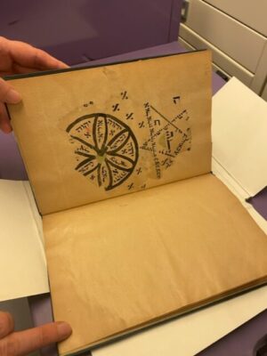 Published on: 11 Jan 2024 Collection Encounter: The Bible Room at Rylands C15 Haggadah • The John Rylands Our last ‘collections encounter’ at the Rylands was in the Bible Room, which is largely closed to the public, and for the last 120 years has stored the printed and handwritten bibles. Priceless leather-bound bibles from all over the world, from many different time periods, in languages as diverse as Armenian, Portuguese, Hebrew and Syrian lined large mahogany bookcases around the comparatively small square room. In one corner sat a low piece of dark wooden furniture called palki that resembled a small four-post bed, which is used during the visit of the Sikh community to display their sacred text. In the center of the room stood a large table, where four special treasures from the Rylands collections had been laid out in advance of our visit for us to explore. The first item we looked at was a tiny fragment of paper, a remnant of the folded pages of a handwritten manuscript (Gaster Genizah A281 & B5756). We bent down lower to inspect the Hebrew text on the tiny fragile remnant, which was pressed between two sheets of glass and resembled the shape of a butterfly’s wing. ‘This faded fragment it’s not just in anyone’s handwriting,’ said Zsófi smiling, ‘it’s in Maimonides’s handwriting!’ Moses Maimonides had been a famous Sephardic Jewish Torah scholar and one of the greatest philosophers of the Middle Ages. He was born in Spain in 1138, then worked as a rabbi, physician and philosopher in Morocco and Egypt, where he eventually became the head of the Jewish community. The unknown autographic fragment we were looking at was a section of the Mishneh Torah (the code of Jewish religious law authored by Maimonides when he was living in Egypt) which had been found in the genizah of the Ben Ezra synagogue in Cairo and was now part of the Gaster collection at Rylands. ‘The Israeli scholar Malachi Beit-Arié identified the first fragment [who had sadly died the previous day],’ said Zsófi. ‘He was the father of Hebrew codicology, which is when you investigate the physical characteristics of a manuscript, and palaeography, which is the study of handwritten scripts. These can help with dating, and to establish the historical context of a certain book.’ Zsófia Buda & Dr Elizabeth Gow with a fragment of the Mishneh Torah authored by Maimonides The Bible Room at The John Rylands Hebrew MS 7 • The John Rylands It was hard to imagine that we would see anything more amazing than this extraordinary historic artefact, but every item Zsófi had selected for us was equally fascinating in its own way. Sat beside the fragment, resting on a cushion, was a fifteenth century Ashkenazi Passover Haggadah, which Zsófi told us had been produced in Southern Germany around 1430 (Hebrew MS 7). The book was open on a particularly beautifully decorated page of the manuscript, which showed the main part of the Passover Haggadah text in Hebrew surrounded by colourful drawings bordered with an illustrated frieze, including depictions of foliage and a lion, a hare, and a monkey amongst other animals. ‘In most such illustrated manuscripts a typical portrayal would be of a family sitting around the table laid for the Seder feast but here you see something quite unique,’ said Zsófi with excitement as she pointed to a lady who appeared to be kneeling in the bottom right of the page wearing a long royal blue dress. Her resemblance to medieval depictions of the Virgin Mary from Christian texts was immediately clear. ‘Visually Mary was very important in the 15th century,’ said Zsófi. ‘In many Western manuscripts, you often see donors imitating her position because she was seen as the ideal pious woman. Ashkenazi Jews lived within a Christian community, so they shared to a certain degree the same visual language, so my argument is that they used the same visual language to depict a pious Jewish woman. And of course, this could also have a polemical edge challenging the superior position of the Virgin Mary.’ Zsófi told us the book was thought to have been produced by an Ashkenazi rabbi for his own personal use, so this lady was most probably based on a family member. She told us it had been usual in Jewish book culture of that period to have self-produced books, which was totally different to the big Christian workshops of that time where they produced manuscripts on a large scale. She showed us another unique page from this same Haggadah. ‘It’s the most fascinating iconography,’ said Zsófi as she showed us another illustrated page of Hebrew text, that appeared to show a group of frolicking babies climbing trees, swimming in a river, and drinking from an urn. ‘This is so unique. I’ve never seen it in any other manuscript,’ said Zsófi, as she pointed to the ‘wildlings’ playing and the large curtain that framed the scene on the bottom left-hand side of the picture. ‘This is an illustration of a midrashic story,’ she said. ‘This story explains how the Israelites could be so fruitful under Egyptian oppression. How? When their time has come, every Jewish woman went out to the fields to give birth without the Egyptians’ knowledge, and they gave birth to sextuplets. Then they went home leaving the babies in the field for the angel of God to took care of them. When the Egyptians came, God covered them with earth then uncovered them, and perhaps the curtain motif refers to this divine intervention.’ 18th century English Machzor (Gaster Miscellaneous MS 1596) • The John Rylands 15th century Italian printed Hebrew text, Incunabula 17277 • The John Rylands The first and last parchment leaves show signs of censorship, Incunabula 17277 • The John Rylands We moved around to the other side of the table to look at another very rare item from the Gaster collection, an eighteenth century Machzor (Gaster Miscellaneous MS 1596). A Machzor is a text that normally contains