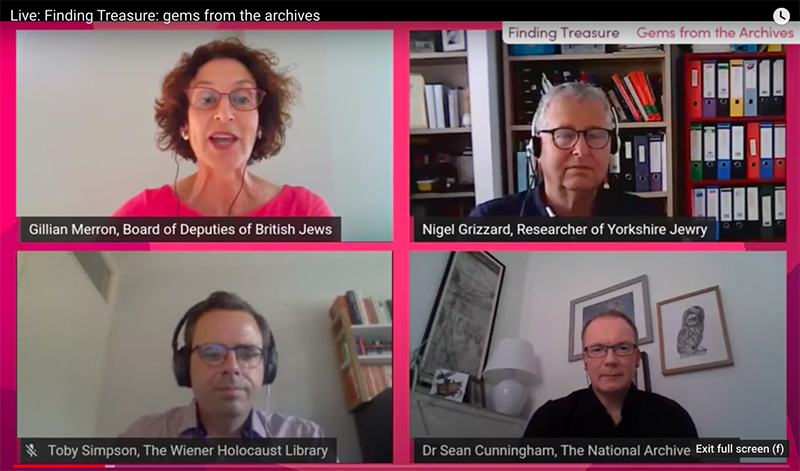 Hidden Treasures Launch Event Report No sooner had the ‘Hidden Treasures’ online launch event started, than it received its first question. An online audience member immediately asked about the availability of oral and video content in archives. This enthusiastic reaction set the tone for a lively and informative launch for the Board of Deputies newest project. Marie van der Zyl, President of the Board of Deputies, began the event by welcoming everyone, before handing over to Dawn Waterman, the Board’s Archives and Heritage Manager, who has led the development of the project. Dawn introduced Hidden Treasures, emphasising the breadth of different archives participating, from national and local government institutions , university special collections and Jewish community projects and encouraging more archives to get involved. Representing three of these archives were Nigel Grizzard for the West Yorkshire Archives Service, Dr Sean Cunningham of The National Archives, and Dr Toby Simpson of The Weiner Holocaust Library. Each expert brought with them a ‘treasure’ from their archive. Nigel Grizzard brought an image of Montague Burton’s sunroom, and with it a brief history of Montague Burton, the entrepreneurial menswear manufacturer, who, in his heyday, was supplying one in every four suits sold in Britain. His philanthropic impact made him the pride of Yorkshire’s Jewish community, a pride that persists to this day. Dr Sean Cunningham presented a medieval doodle, drawn by a clerk during what must have been a particularly boring court case. Some Christian and Jewish boys were charged with “stealing the King’s deer” and one of the boy’s fathers, a Jew named Aaron, took to the stand to defend his son. This was the first of several items he presented that illustrated the uneasy relationship between the Jews of Medieval England and the local authorities. The final presentation by Dr Toby Simpson, of the German 1930’s board game Juden Rauß – ‘Jews Out’ – stretched the limits of what might be called a ‘treasure’, but represented an important aspect of the history of Britain’s Jews. The long shadow of the Nazi Party, the Shoah, and antisemitism, can be found in many of Hidden Treasure’s archives, with the Wiener Holocaust Library containing some of the most harrowing and sombre material. These three archives, and the items that were presented, represent only the smallest fragment of the vast amount of material that Hidden Treasures can guide you to. But the launch didn’t end there as questions poured in from the viewers. The experts were asked about how to build family archives, how to deal with digital memories, and, of course, about the availability of oral and video content in their archives. The launch closed with Gillian Merron, Chief Executive of the Board of Deputies, who was chairing the panel of experts and fielding the questions, thanking our media partner The Jewish Chronicle and leading a quick round up. Dr Simpson summed up the evening, and Hidden Treasures itself, commenting that with archives “people need a way in” and that once you’re in “then you’re hooked”. Hidden Treasures: Celebrating Jewish Archives in Britain is now well and truly launched and we look forward to guiding visitors back into the past, helping them look at the present with new eyes, and think about the future. ––Daniel Cesarani Watch the event: Read more news stories Hidden Treasures: Celebrating the documents, photos and artefacts in British archives that tell the story of Jews in Britain