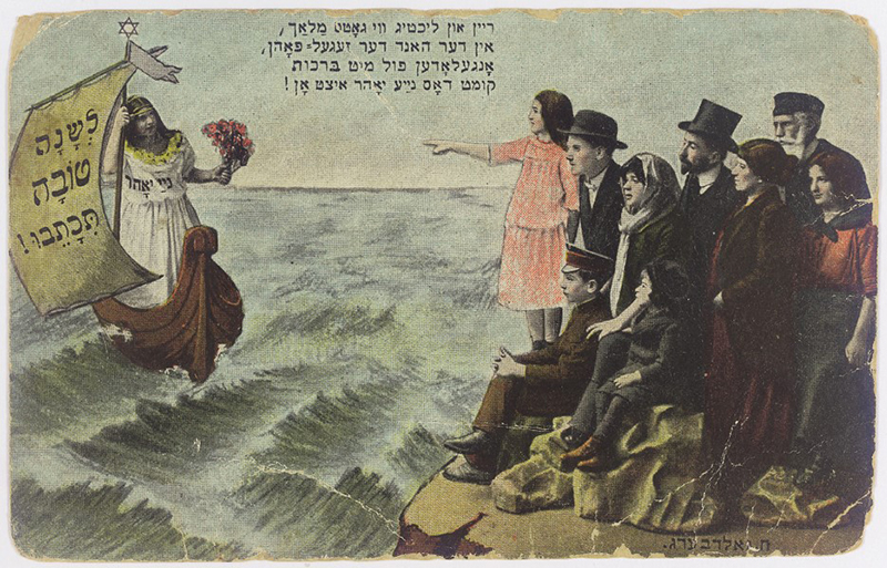 This charming treasure is a Rosh Hashanah (Jewish New Year) postcard printed in Warsaw in the late 1920s. It’s part of the Jewish Museum London‘s collection. It shows a group of Jewish immigrants awaiting their ship, which in this case is sailed by the figure of the New Year. Themes of immigration were common in New Year postcards from this time, as more and more East European Jews looked to move west to America and to England.